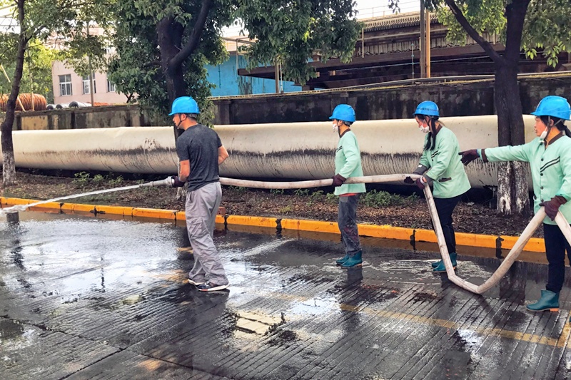 活動分三個小組進行,當(dāng)天中午分別對廠區(qū)的恒泰路、恒福路、誠信大道、中和大道進行一次大規(guī)模清掃。對于道路上難清理的泥沙、煤灰用消防水進行了沖洗,并將積水及時清理至水溝排出。綠化帶里積存的樹葉被清理至廠區(qū)廢品堆場的規(guī)定區(qū)域。工作中,大家分工明確、齊心協(xié)作,在沖水和排積水時,許多員工的鞋子雖被浸濕,但仍帶著汗水熱情滿滿。